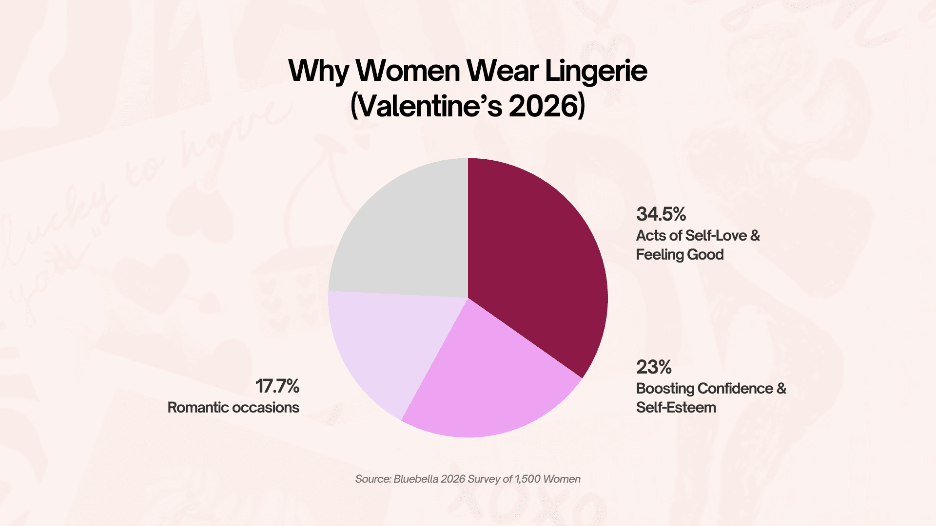 When Bluebella surveyed 1,500 women in 2026 about why they wear lingerie, romantic occasions ranked only third (17.7%). The top two reasons? Acts of self-love and feeling good (34.5%) and boosting confidence and self-esteem (23%).